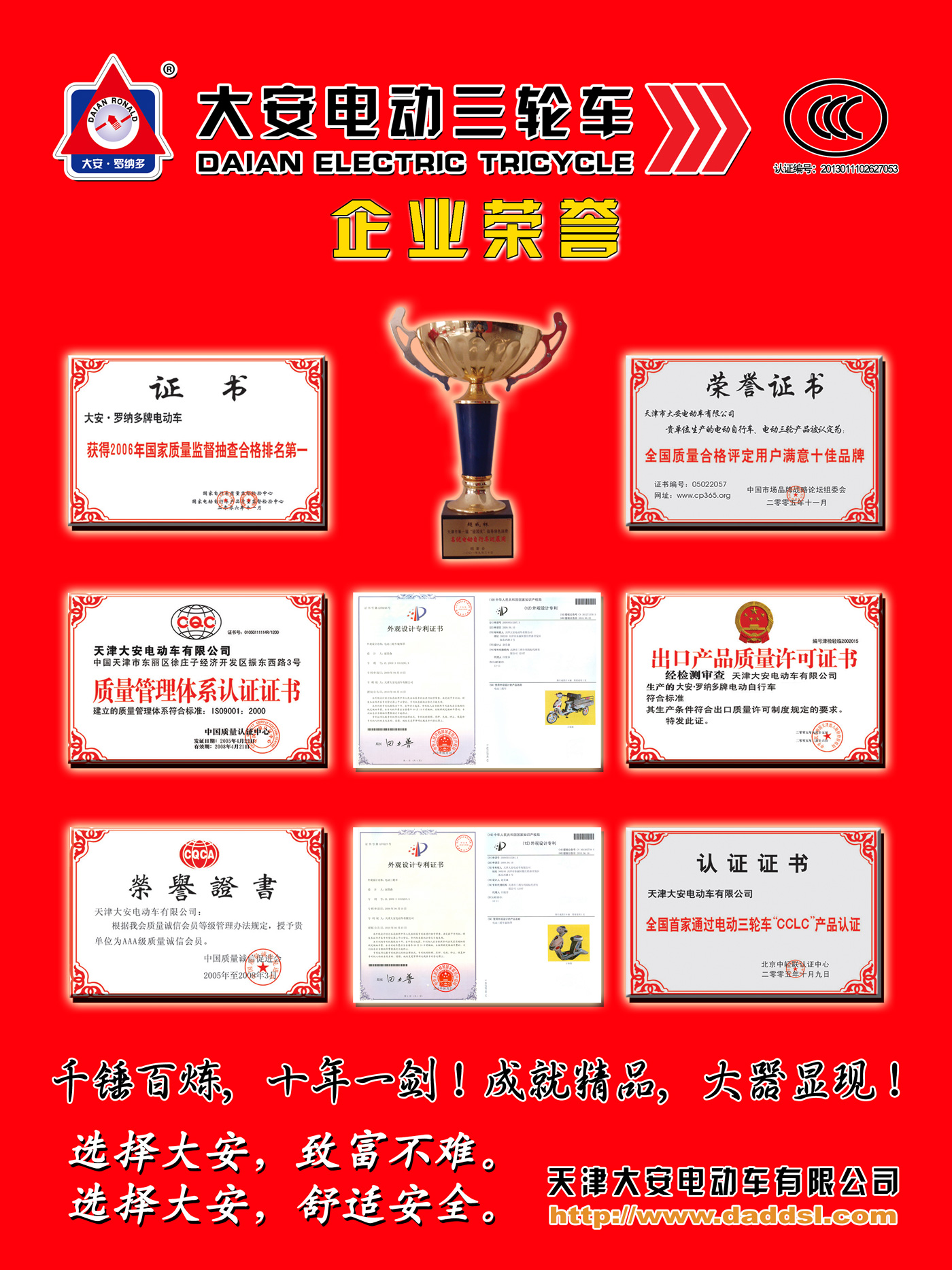 天津大安電動車有限公司 大安·羅納多電動三輪車證書寫真版下載